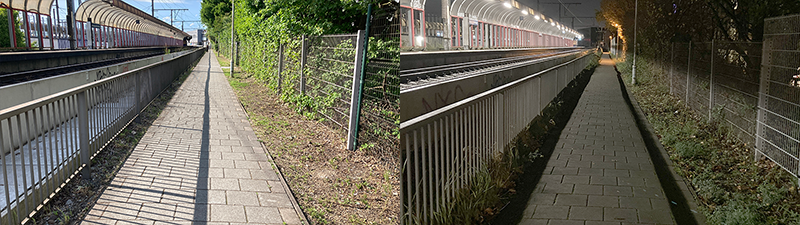 Hieronder zie je twee maal hetzelfde voetpad, langs Berchem treinstation. De linker foto is met zonlicht, daarnaast de stituatie met de verlichting die bij de overkapping van het perron hangt. De schaduw van de leuning van de balustrade is telkens heel goed zichtbaar maar de schaduw van de dunne spijltjes lijkt in vroege ochtend verdwenen.