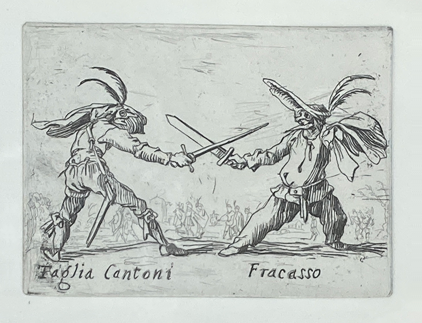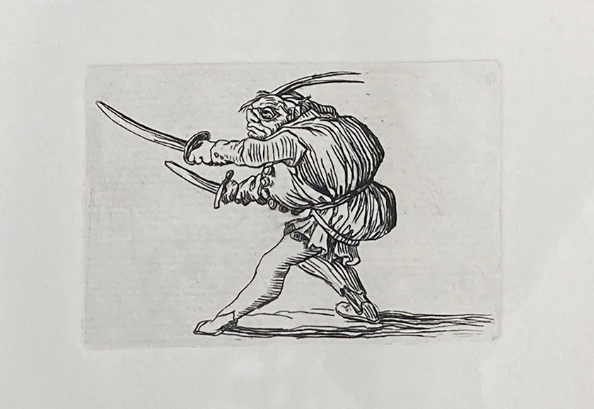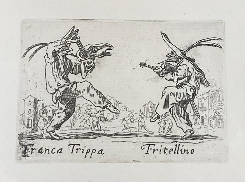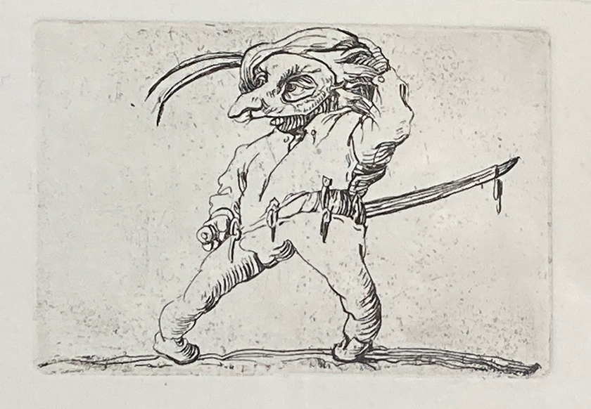 Hieronder. staan 4 kleine etsen die Leen maakte naar het voorbeeld van Jacques Callot, de graficus die vóór Rembrandt los en speels de etsnaald in de waslaag bewoog. Deze figuren komen uit de reeksen Balli di Sfessania en Les Gobbis, ter gelegenheid van de tentoonstelling James Ensor, Inspired by Brussels (2023).